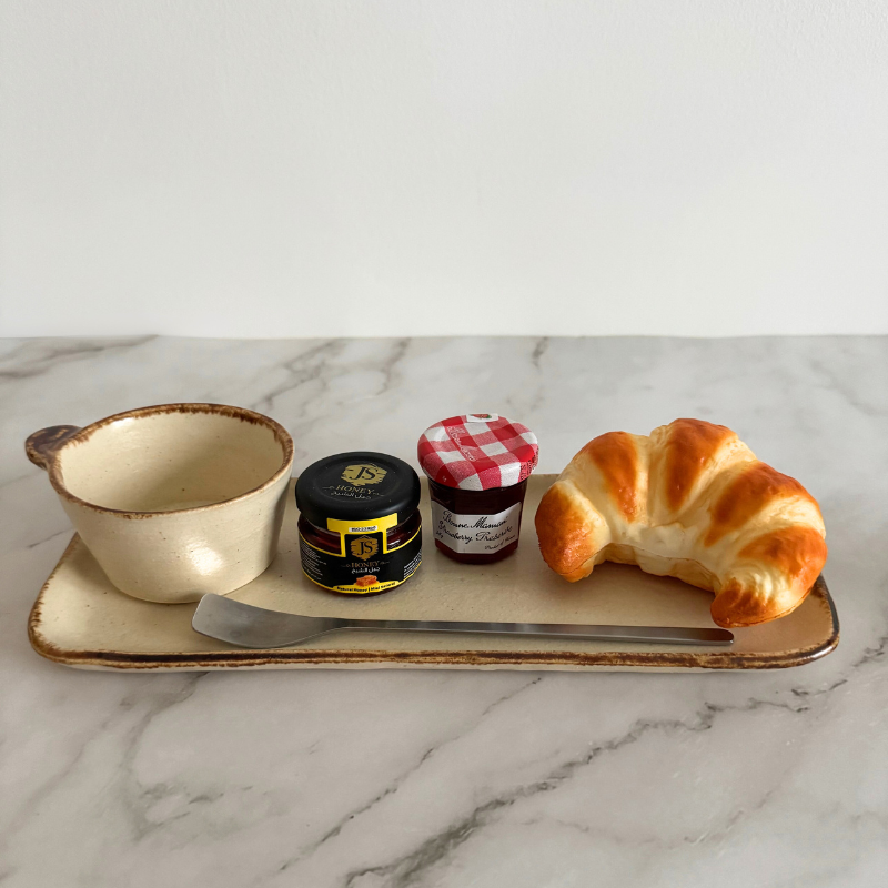 The minimalist design highlights the timeless charm of Mashiko ware, making this rectangular plate a versatile addition to your daily life. With its unique shape, it serves multiple purposes—perfect for serving breakfast with freshly baked pastries and condiments (sauce cup not included), or for presenting homemade Japanese sushi. Its simple, elegant form enhances the beauty of any dish with a subtle, refined presence.